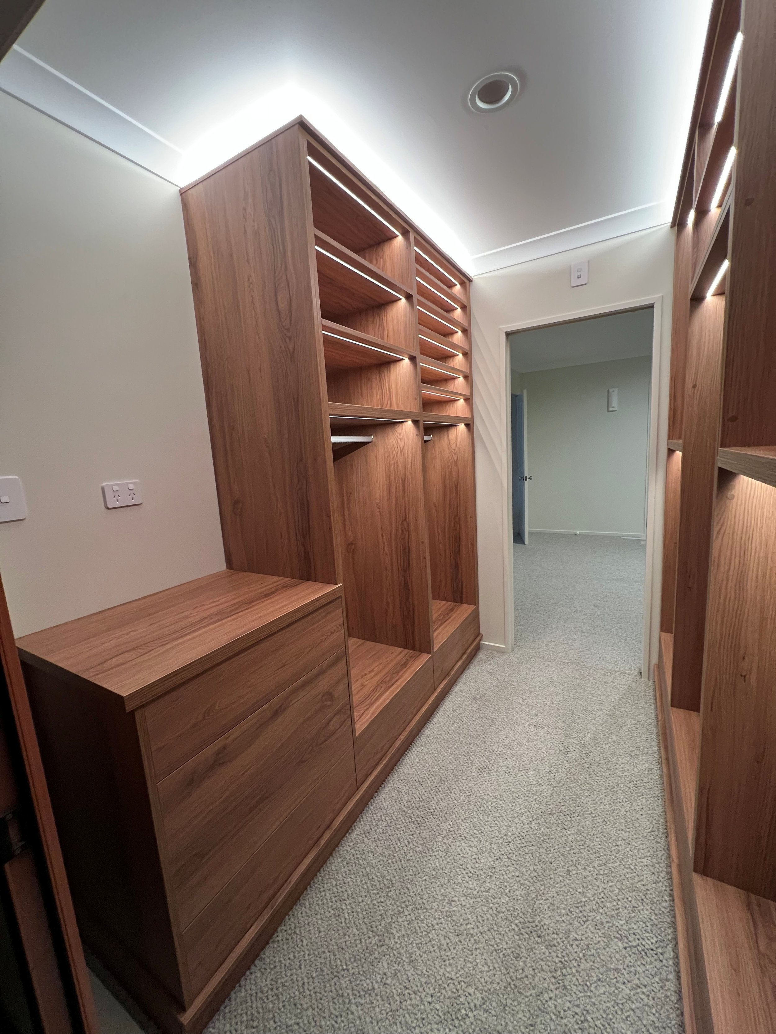 For his third and most complex project, Richard partnered with Cutshop® to create a custom walk-in wardrobe for a renovated dressing room. The vision was clear: maximise storage in a limited space without sacrificing visual appeal or accessibility.