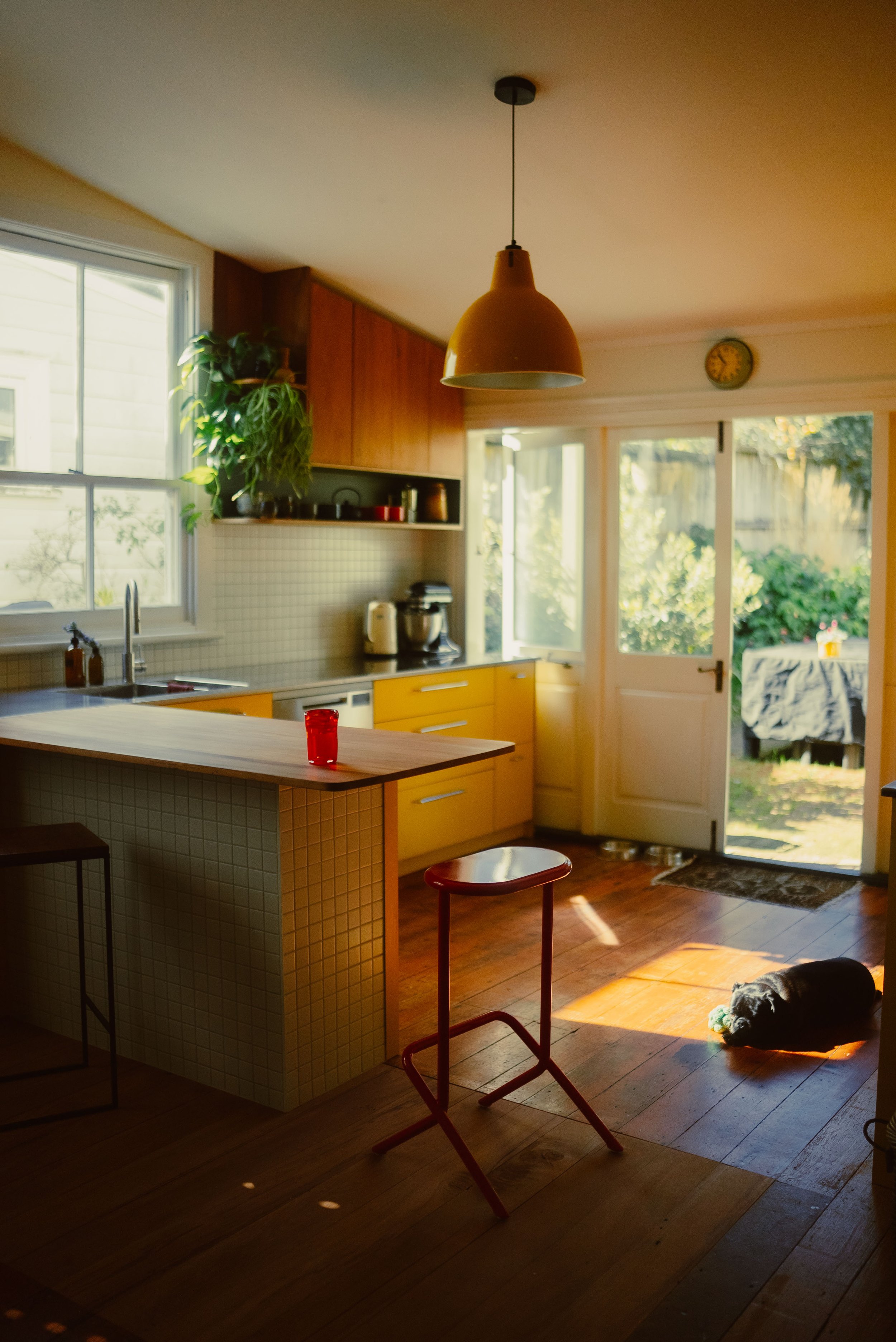 The design drew inspiration directly from the clients’ home and personal history. Nodding to a kōwhai tree in the backyard and a yellow family heirloom, Saffron yellow HPL plywood became the vibrant foundation. This was paired with forest green (Plytech Create HPL in Kea) and reclaimed native rimu for the overheads and peninsula table, balancing the old with the new and paying homage to the villa's heritage.