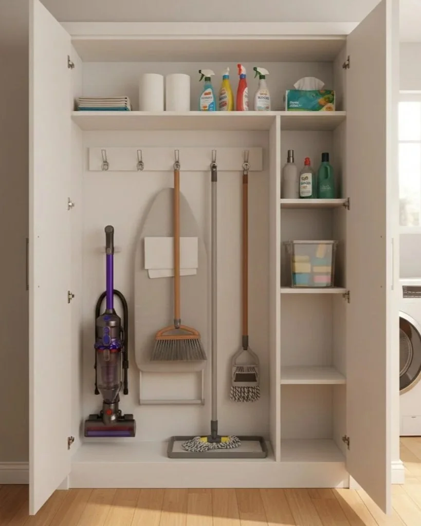 When designing a highly efficient laundry or utility room, the goal isn't just to store clothes… It's to conquer the clutter of the other necessities: mops, vacuums, cleaning chemicals, and the notoriously awkward ironing board.