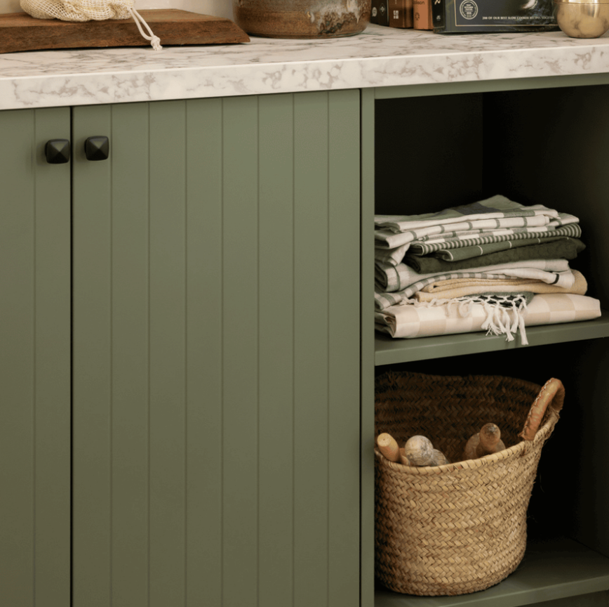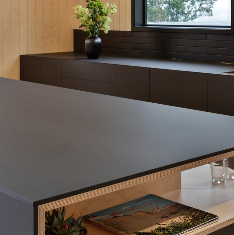 The Look: Consider a stone-look HPL (High-Pressure Laminate) benchtop paired with vertically grooved cabinet doors.