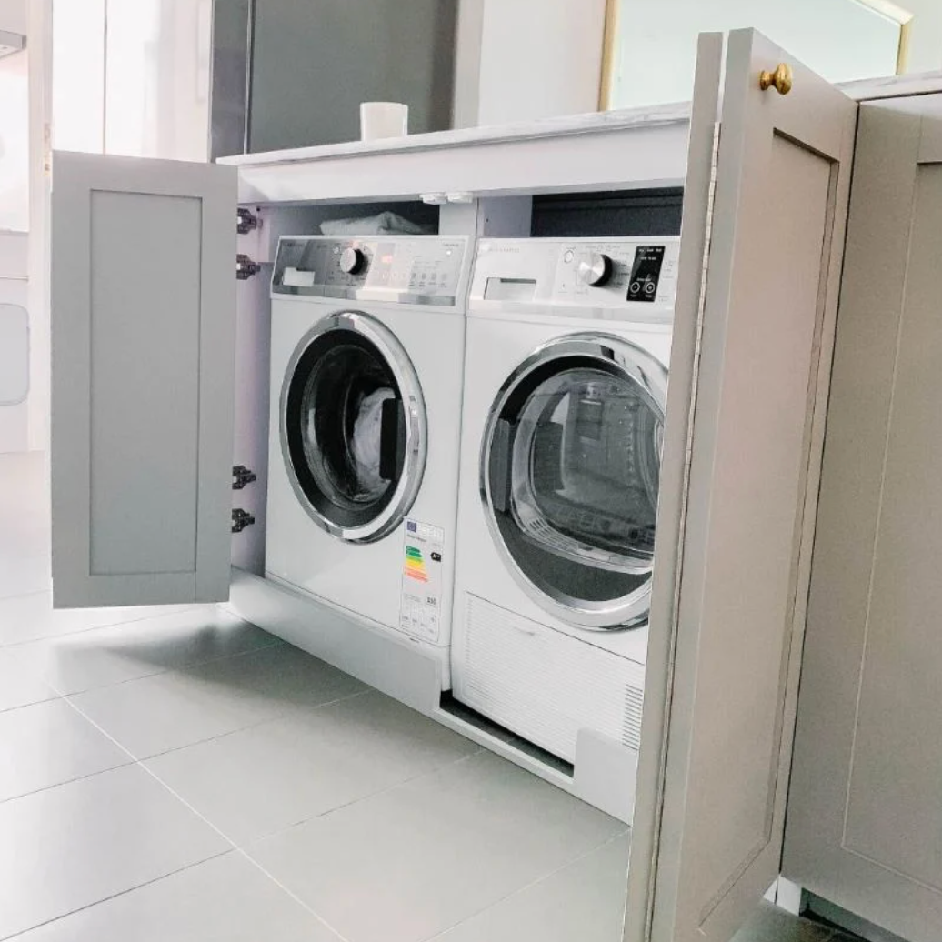 By using custom-cut cabinetry, you can enclose your appliances and storage behind beautiful, floor-to-ceiling doors. This creates a clean, built-in look that protects your laundry from garage dust and keeps your home looking organised.
