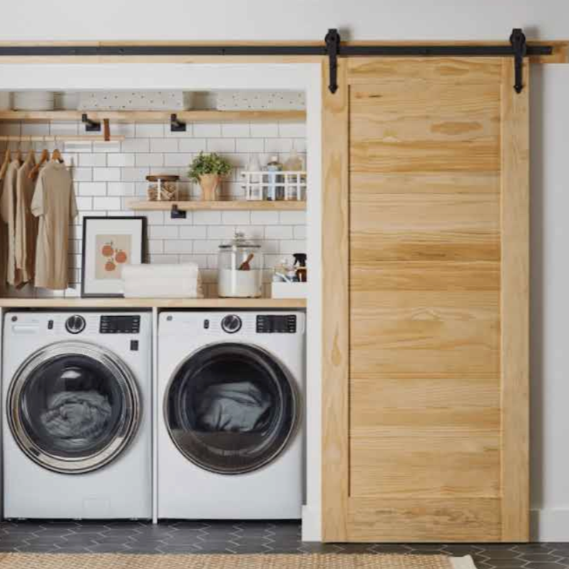 The secret to hiding the laundry lies in the doors. When the laundry is not in use, it should look like a sleek wall of cabinetry or cleverly hidden with a barn-style sliding door.