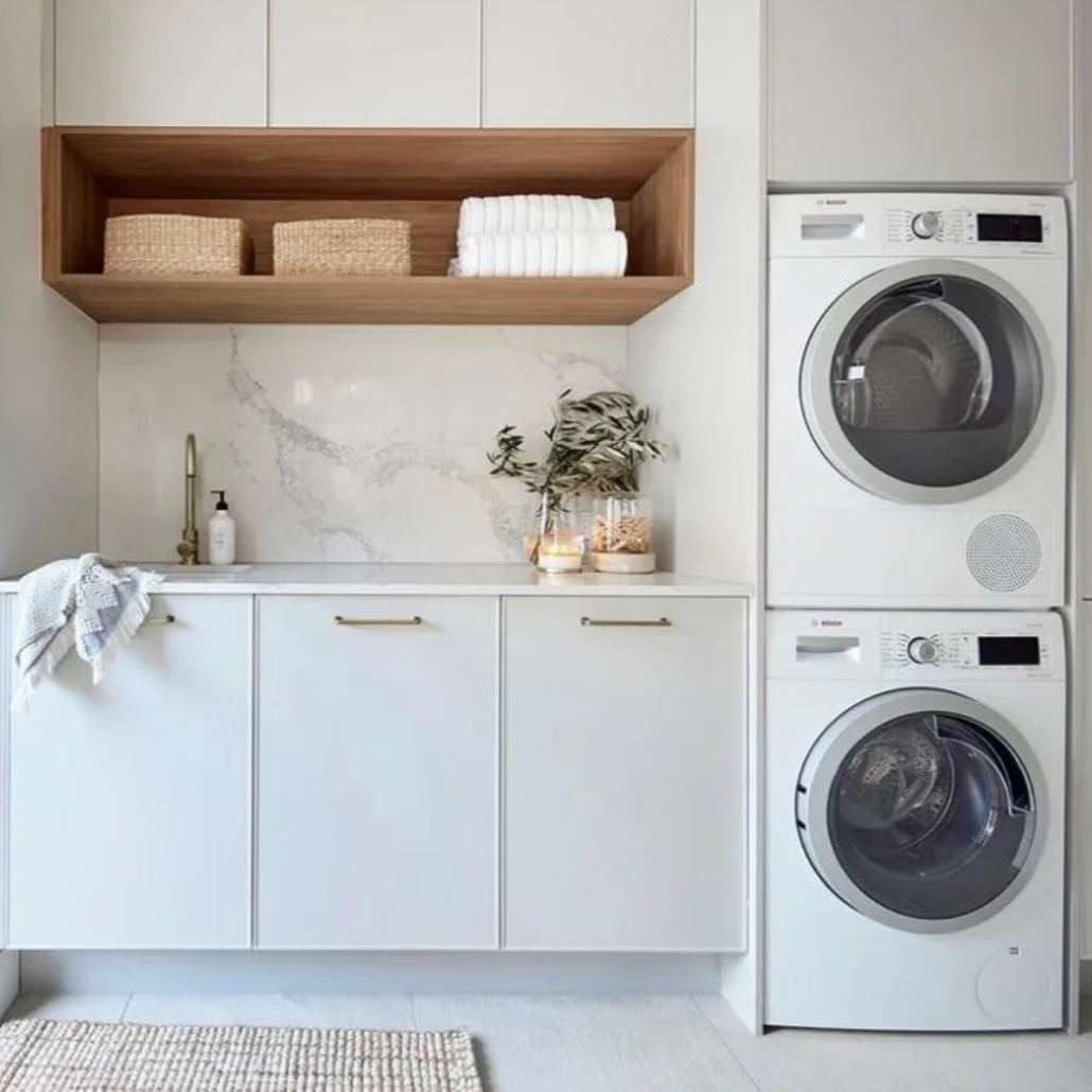 The Benefit: Boxing in your appliances provides a structure for a benchtop and upper cabinets. It creates a defined room-within-a-room feel that separates your clean clothes from the rest of the garage environment.
